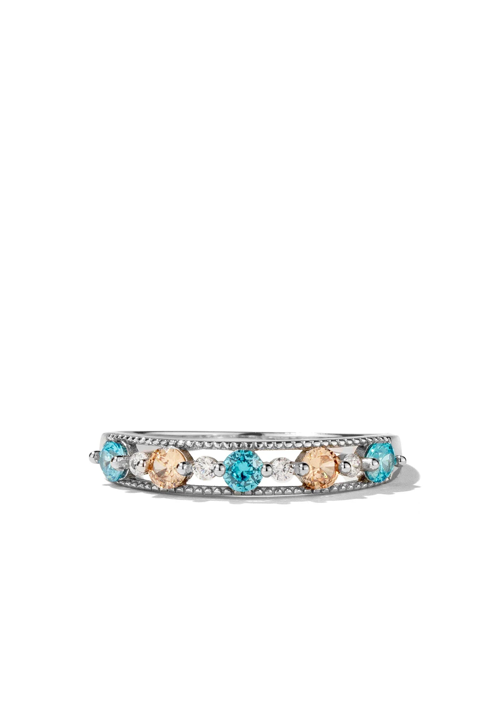 - Design: Aquamarine and peach crystals inside a gold band