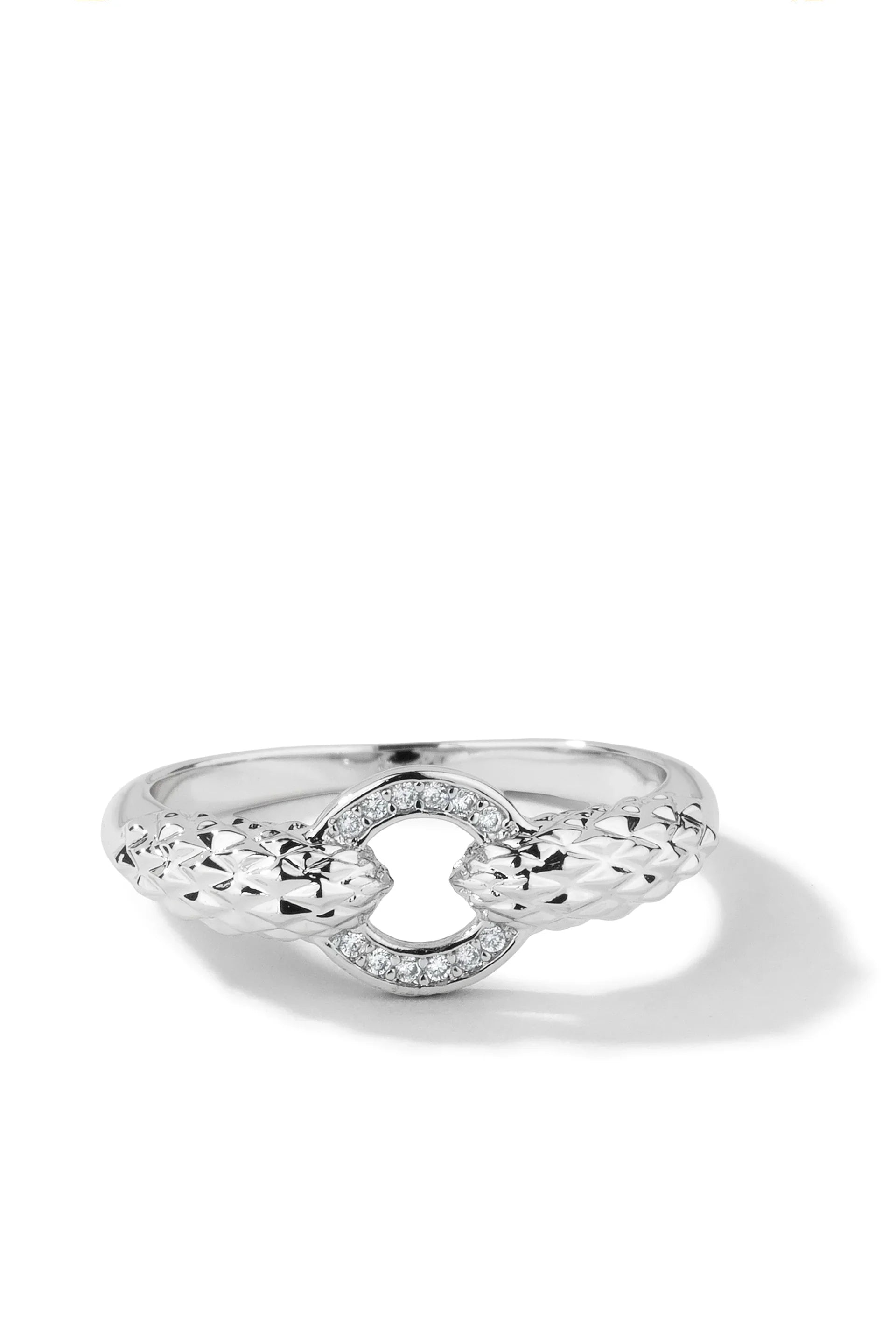- Design: Snake band ring with white crystal circle center