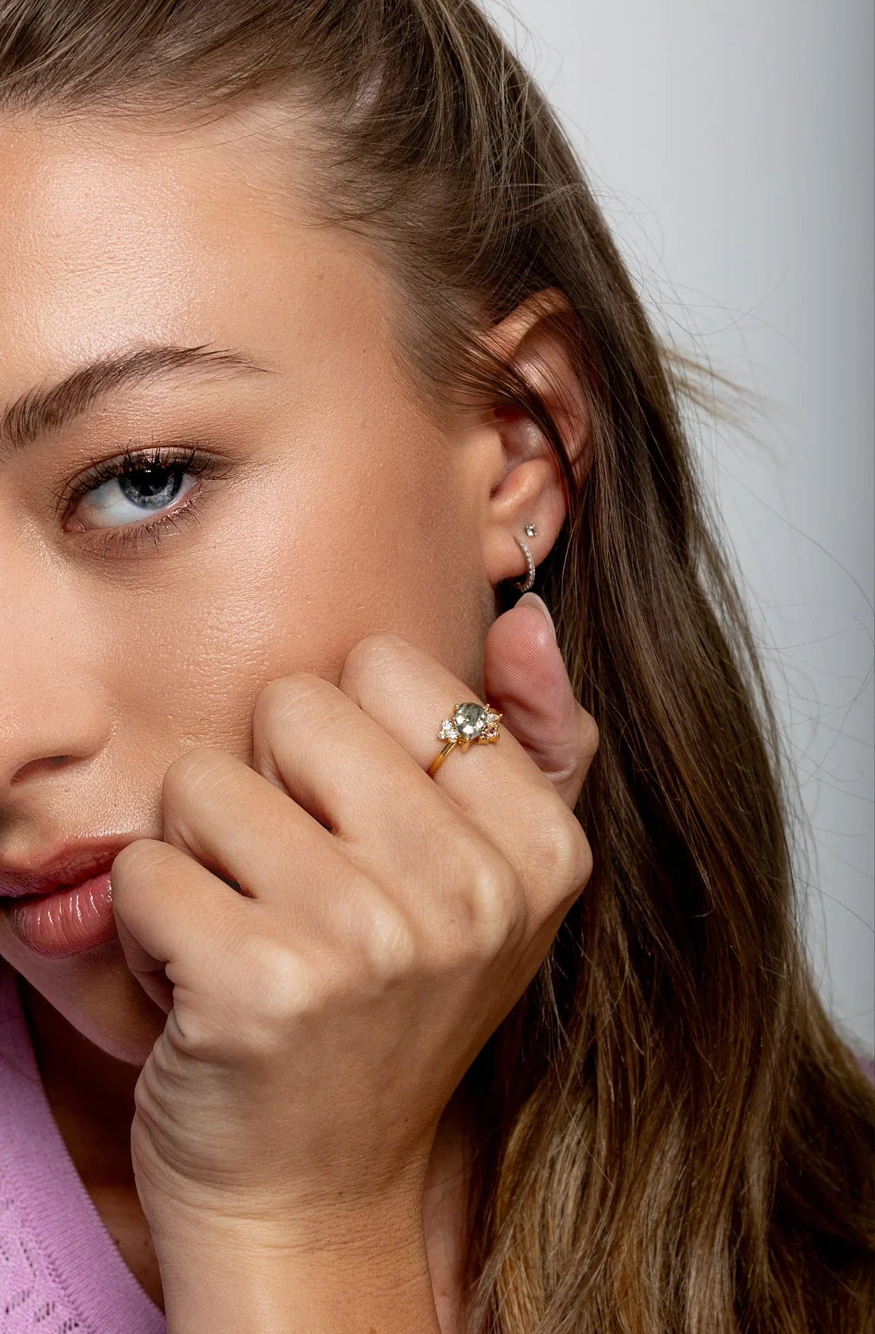 - Design: Olive grey pear cut crystal with pink and white accompanying crystals